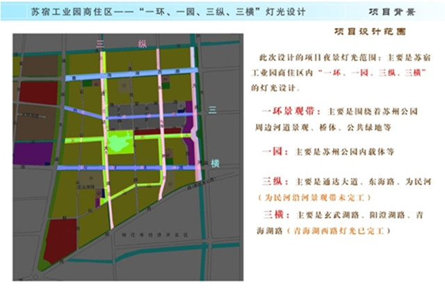 本次商住區(qū)亮化提升工程圍繞“一環(huán)、一園、三縱、三橫”進(jìn)行重點(diǎn)打造,燈光設(shè)計(jì)以“綠色的、生態(tài)的”為定位,不但要展示宿遷的城市特質(zhì),提升市民的自豪感和安全感,鼓勵周邊市民夜間步行,還將以現(xiàn)代科技之光區(qū)展現(xiàn)蘇宿園區(qū)騰飛的城市變遷。