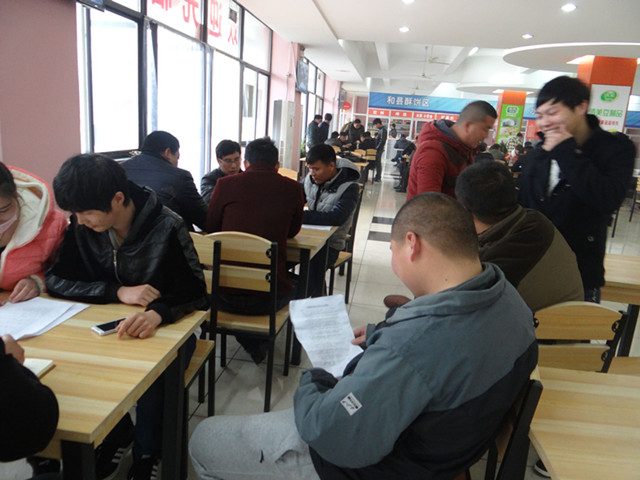 食堂的餐桌上被各種材料所覆蓋,盡管食堂中的噪音不小,有廚房炒菜的聲音,也有員工就餐時聊天的聲音,可是絲毫影響不了備考員工的熱情。一些員工一邊吃飯一邊看書,還有的正在念念有詞地背書。