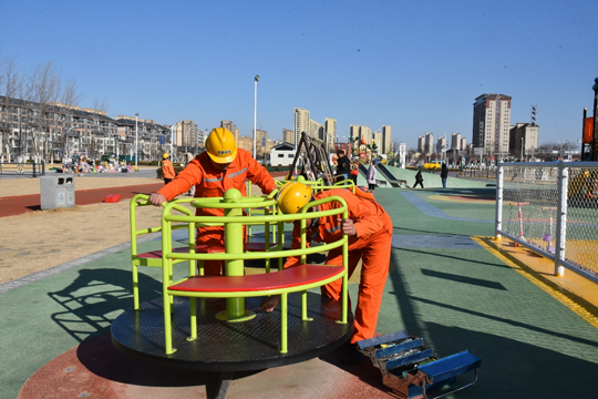 在公園廣場(chǎng)里,秩序井然,工作人員一絲不茍地對(duì)游樂健身設(shè)施進(jìn)行全方位檢查,“不遺漏”任何一顆螺絲、一根繩子,確保設(shè)施安全運(yùn)行,讓市民游客過一個(gè)“放心年”。