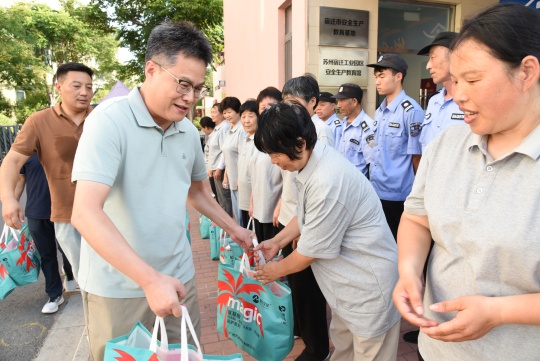 入伏以來(lái),宿遷持續(xù)高溫晴熱天氣,給堅(jiān)守一線崗位的勞動(dòng)者帶來(lái)不小挑戰(zhàn)。為有效落實(shí)防暑降溫措施,切實(shí)保障一線員工身體健康與作業(yè)安全,7月24日,建發(fā)公司組織開(kāi)展了一線員工高溫慰問(wèn)活動(dòng)。公司副總經(jīng)理倪松、相關(guān)部門(mén)負(fù)責(zé)人參加了慰問(wèn)。