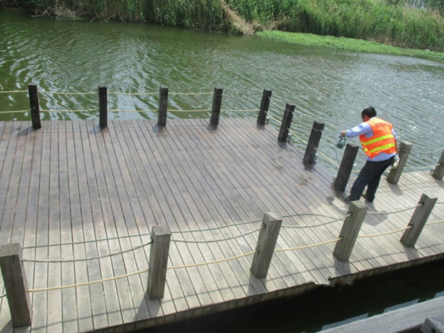 維保工作首先從為民河公園開始。為民河公園于2012年12月竣工投入使用,為園區(qū)最早建成的景觀公園之一。公園內(nèi)有賈拉木棧道約570平方米,硬木扶手、欄桿約402米。隨著使用年限增加,公園部分設(shè)施特別是木棧道、親水平臺等逐漸發(fā)生了老化,木材表面出現(xiàn)不同程度的褪色和裂紋,影響了親水平臺的景觀效果。為此,公司先安排維保人員對破損處進行維修,然后清掃干凈噴漆,待自然晾干后再開放通行,給親水平臺穿上了新“嫁衣”。